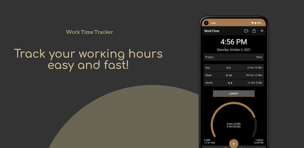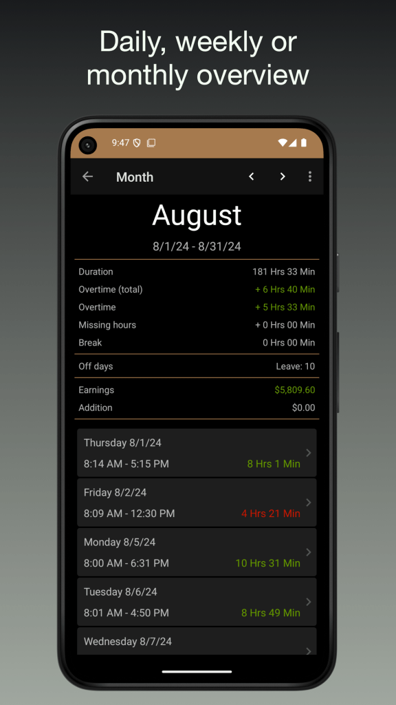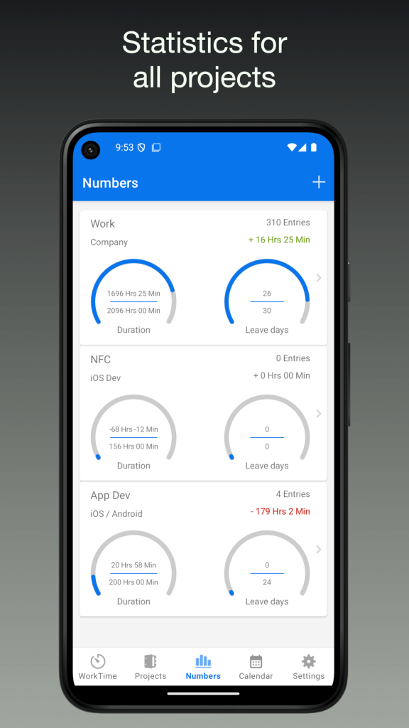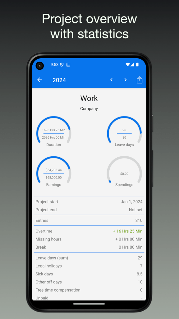 Track your working hours easy and fast! Get an overview of your earnings, overtime, working hours, holidays or leave days. Export your work time e.g. via email!