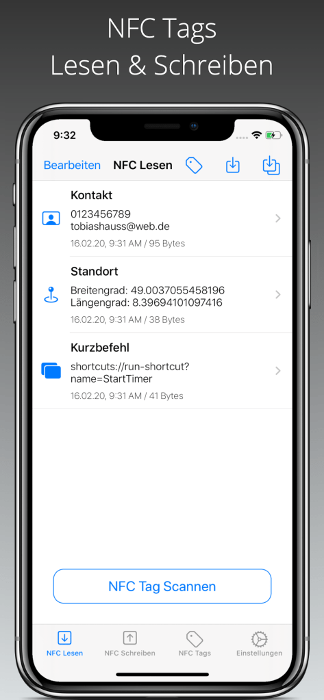 Du kannst die Daten eingelesener NFC Tags direkt öffnen, zum Beispiel eingelesene Kontaktdaten Deinen Kontakten hinzufügen oder Kurzbefehle ausführen.